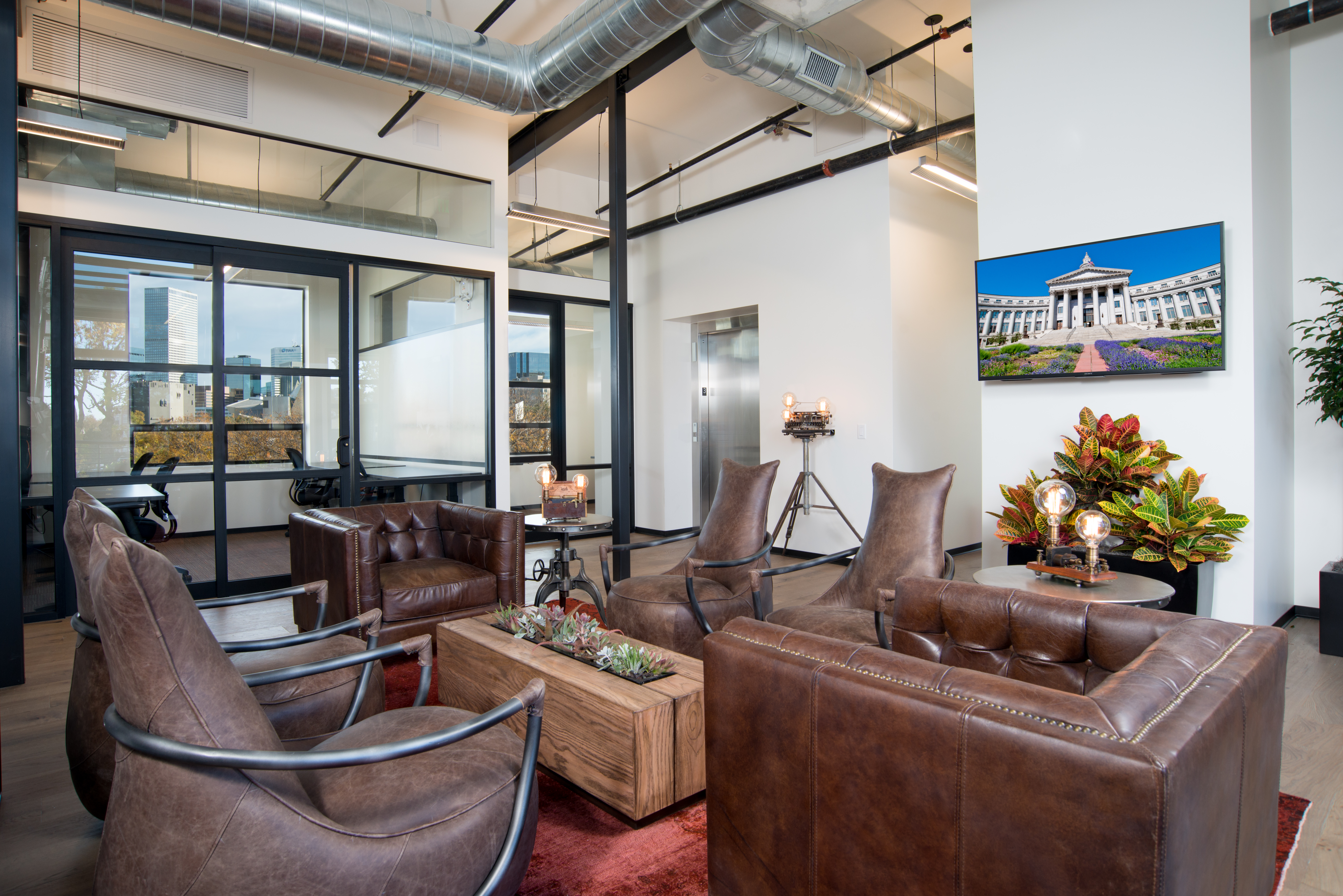 Our refined industrial style is enhanced by over 50 unique pieces of art, furniture and wall coverings custom made by over a dozen local artists.